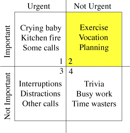 Strategic thinking and planning falls in the Important and Not Urgent quadrant. Unfortunately, this is a much-neglected area of our lives. Because we are so focused on staying busy, Urgent items always get done. However, now that you know strategic thinking is important AND you’ve created time in your calendar for it, you can start to check off some items in the Important and Non Urgent quadrant. Ironically, stating and evaluating our priorities falls into the same Important and Non Urgent quadrant, which means it too is always at the bottom of our to-do list.